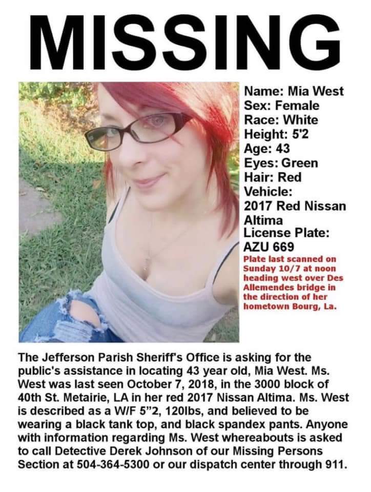 Lafourche Parish Sheriff Craig Webre announced a body has been located which is believed to be that of a missing Metairie woman whose car was also found nearby. Mia West, 43, had been missing since October 7, 2018. An investigation into her death is now underway.