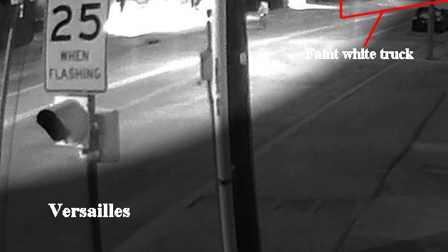 There are no pics of perps in areas with no cameras. And there were many areas on her route with no cameras. That said, someone pointed out to me - I somehow missed the discussion way back - the white blob in the Versailles pic. That looks like a poor police Photoshop whiteout. I'm decently handy with Photoshop,,, and when you add that to the black car on the side of the road in that pic, where no car should have been parked that time of night, I'm wondering if there were a few people hanging out on the sidewalk there under the bus overhang at Cathedral-Carmel school. I could see the police whiting that out if they didn't want to tip those folks, and to steer discussion away from that angle.