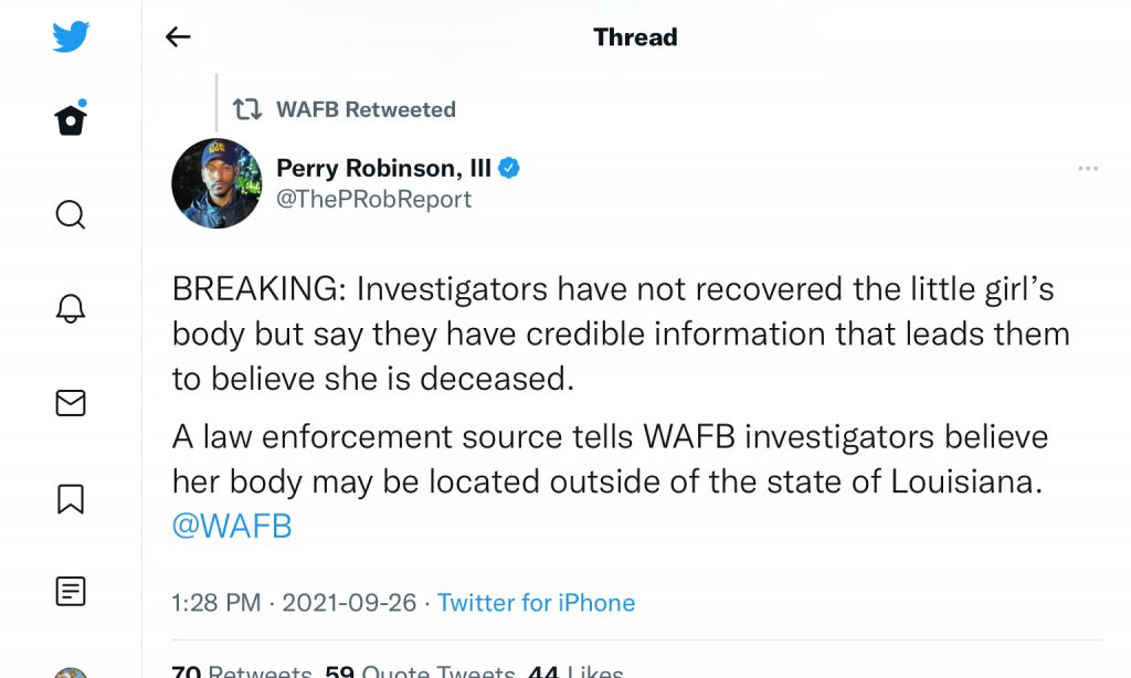 Investigators have not recovered the little girl’s body but say they have credible information that leads them to believe she is deceased. A law enforcement source tells WAFB investigators believe her body may be located outside of the state of Louisiana
