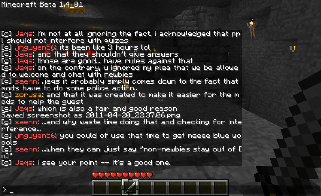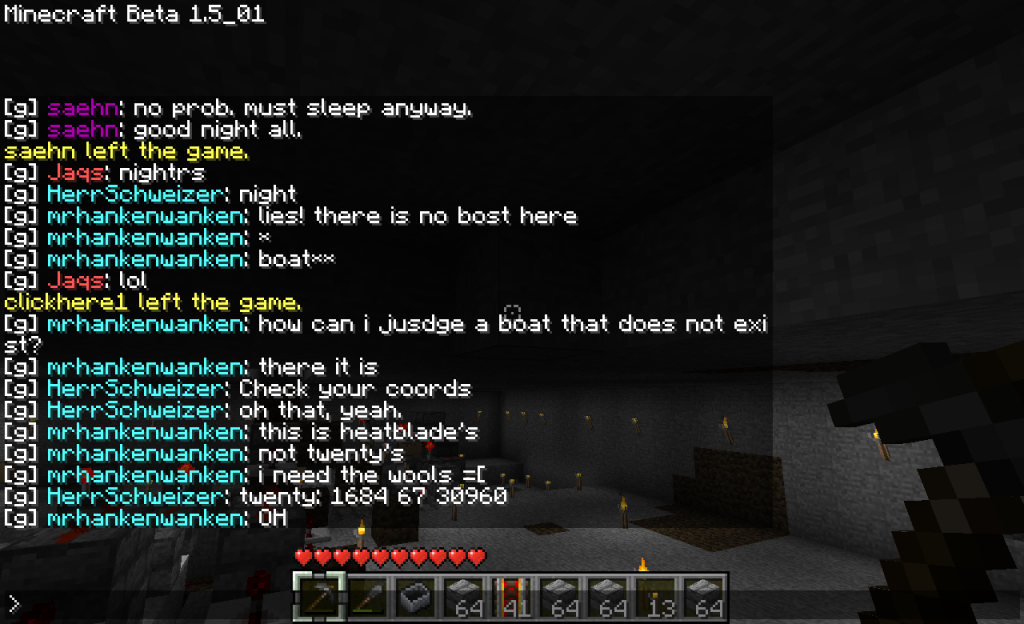 [After writing this I realized I might have screenshots from Minecraft that mention saehn (Shane) and I found a couple random ones I'm including. They just happen to include chat from saehn -- who's name, I just now realize over a decade later was just an anagram -- you're funny man, thanks for the laugh).