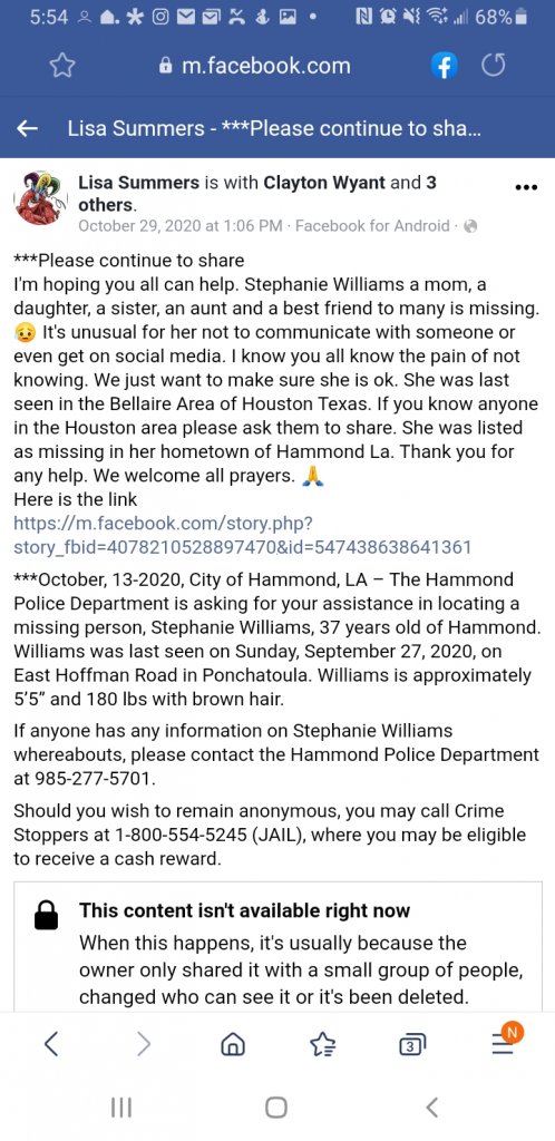 10-13-2020, City of Hammond, LA – The Hammond Police Department is asking for your assistance in locating a missing person, Stephanie Williams, 37-years-old of Hammond.