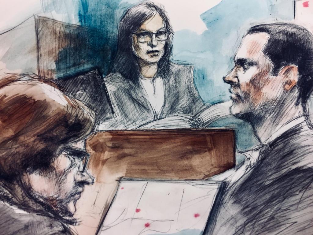 "Here's a sketch of Nicole Rubelo, the intelligence analyst with Toronto Police Service, with Crown Ken Lockhart (right) and Millard (left)"