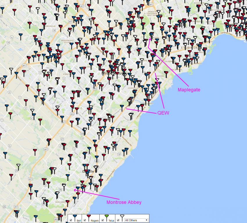 Note - these are TODAYS towers, not 2012, but regardless, DM's "suggestion" of a QEW cell hitting the tower south of Maplegate is ridiculous at best.