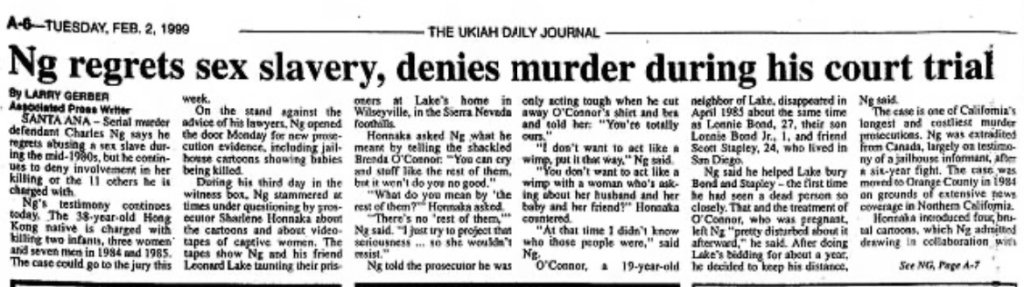 In the meantime, Ng fled to Calgary, Alberta, Canada via Chicago and Detroit. He remained a fugitive for a month but was once again caught shoplifting. At the police station, he fought back against two police officers, shooting one of them in the hand during the struggle. He was charged and convicted of shoplifting, felonious assault and possession of a concealed firearm and was sentenced to four and a half years in prison. When the American investigators found out about his incarceration, they tried to have him extradited and interviewed him in prison. Ng, who spent his jail time studying American law and sometimes drawing cartoons depicting murders (some of which had been committed at the Wilseyville ranch), admitted to his involvement in his and Lake's murders but claimed that his part had been mostly limited to disposing of the corpses. The Canadian authorities refused to extradite him on the grounds that Canada had abolished capital punishment and Ng could be executed if he was returned to the U.S. It took six years of legal proceedings to have him returned to California in 1991, in part because of the testimony of a man who had survived an encounter with Ng, and even then the legal battle wasn't over. It took another seven years and over $10 million worth of the taxpayers' money for him to be put on trial for murder in October of 1998. In July the next year, he was found guilty by the jury on almost all counts and sentenced to death. The charges for the murder of Paul Cosner were dropped on the grounds that it couldn't be proven with absolute certainty that he had died by Ng's hand. In total, Ng's legal battle with the state of California cost over $20 million. He is currently on death row in San Quentin.