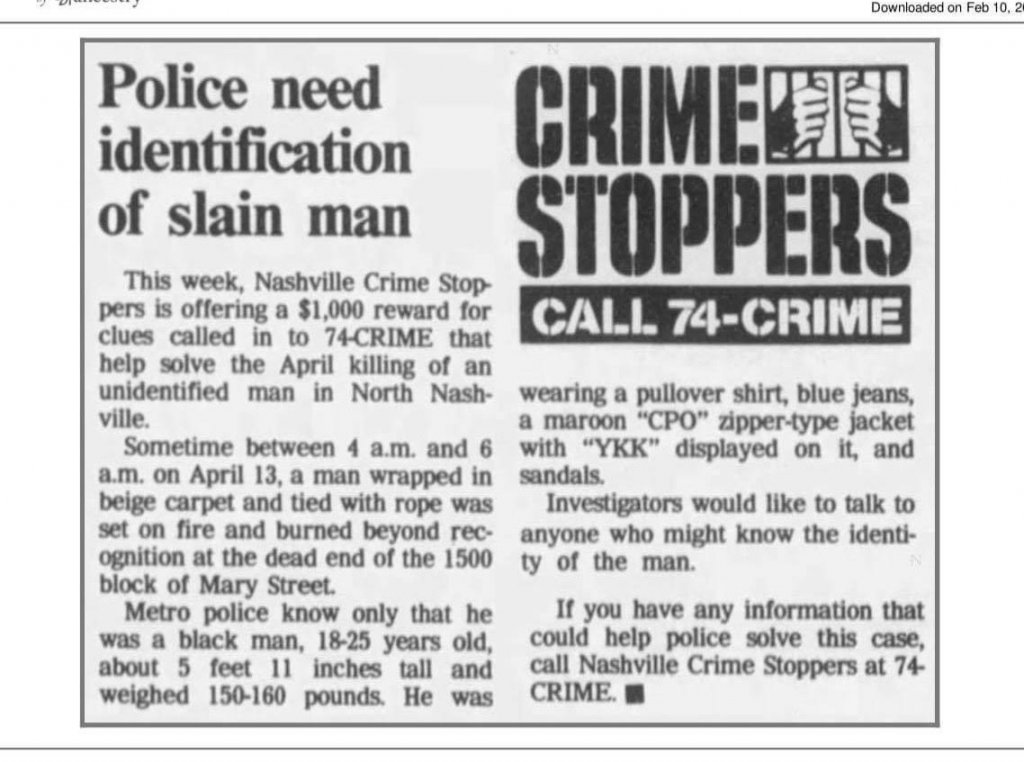 His mother does not answer any questions, when we try and get a timeline from her or when asked why she would tell us he was in Kentucky when he actually was already deceased. She told this to everyone in the family. When he was finally identified, she had the memorial and did not tell us when and where it would be had. Since she was the mother she had total control over that process. Notice in the Tennessean there are no pictures of the family there at the gravesite. We did not get to witness him finally getting his headstone.
