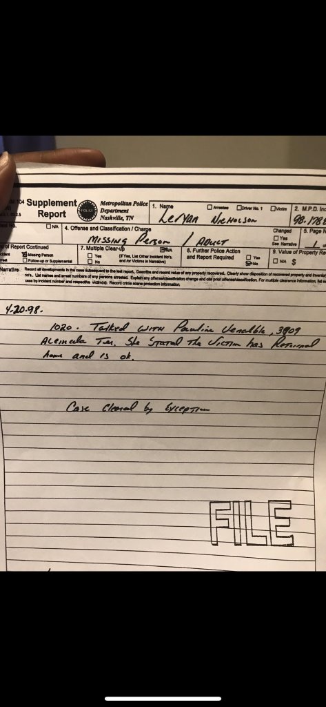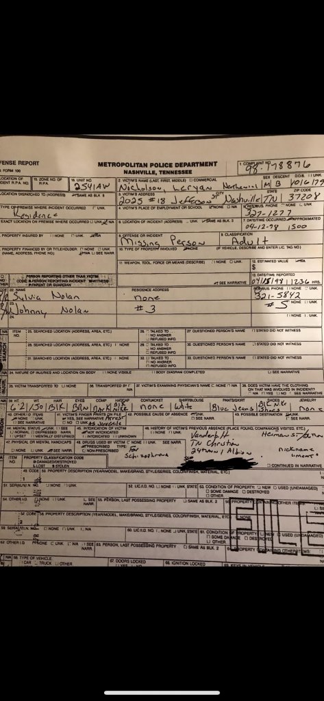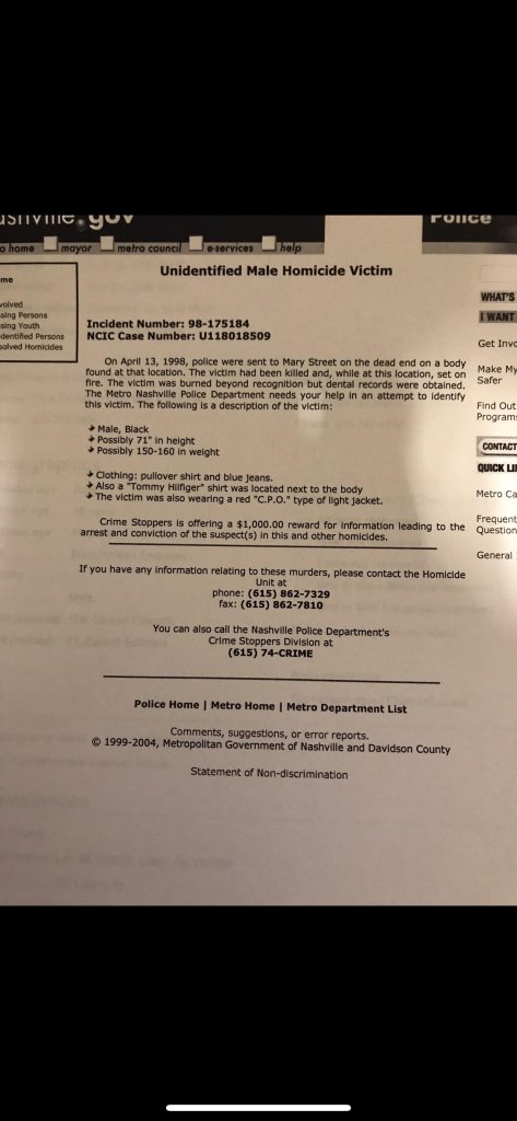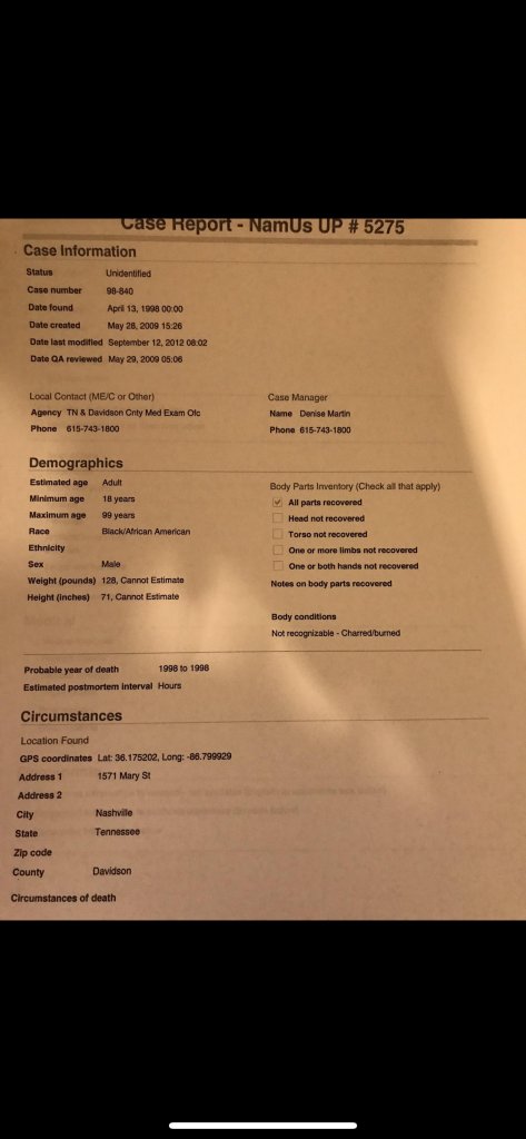 The excuse we got from MNPD about how they could not have put one and one together to make two about the missing a persons case and the murder victim, and why they accepted the callers statement and did not go and do a welfare check was.. that year we had a tornado in Nashville and they said all their resources were used for that and did not have anyone to send. That is totally unacceptable. But that is the explanation we received.
