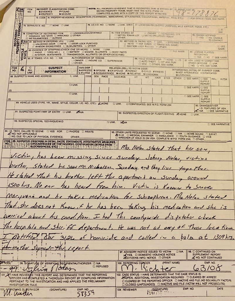 Below I have attached the missing persons report and the news reports that were printed when my brother's body was found in 1998.
