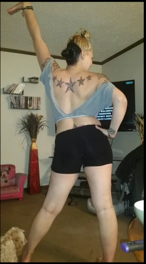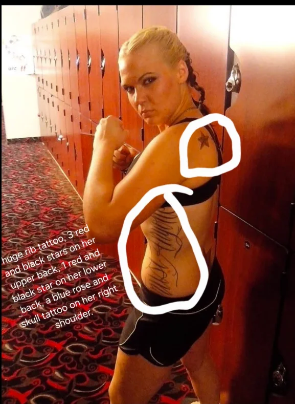 5 red and black stars from left shoulder blade to right shoulder blade on upper back