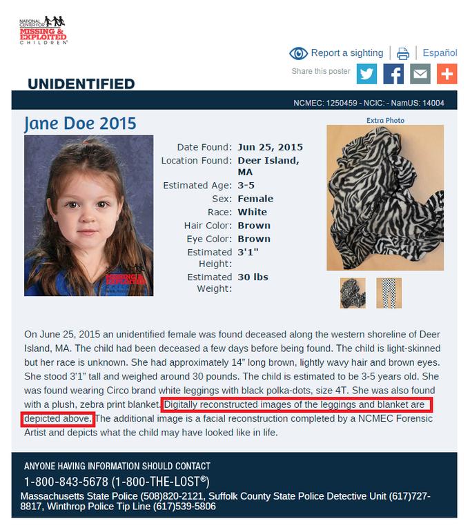 "This image depicts what the child may have looked like in life. We are also releasing images of the leggings she was wearing when found, which are white with black polka dots, and of a black and white zebra-stripe blanket found with the child’s body."