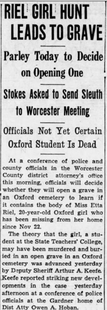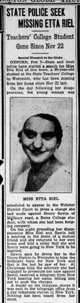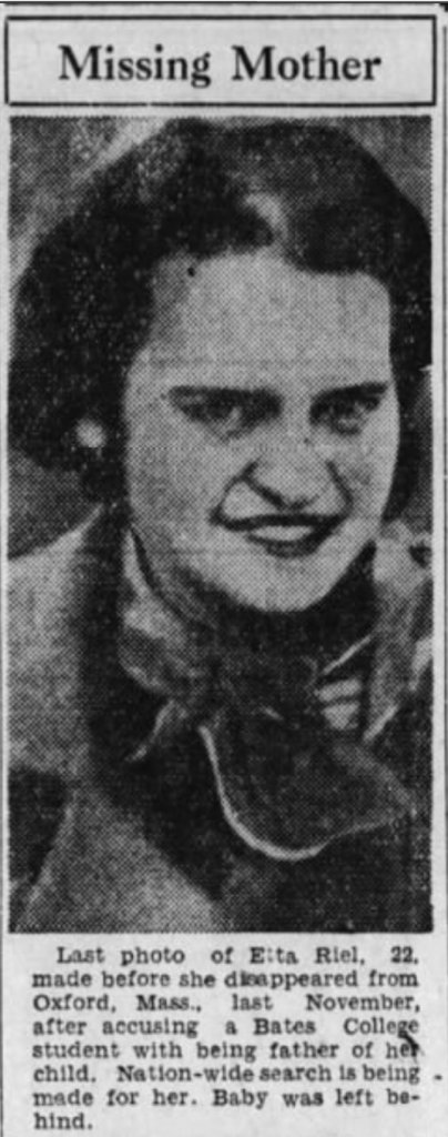 In early 1934, Etta Riel was living with her family in Oxford, Massachusetts and attending nearby Worcester State Teachers College. In May she had filed a paternity suitagainst a local man, Henry Sawin, who she named as the father of her unborn baby. She and Sawin were dating at the time they graduated from Oxford High School in 1932. Sawin moved to Maine to attend Bates College, but he and Riel remained in contact. In September, Riel gave birth to a baby girl.