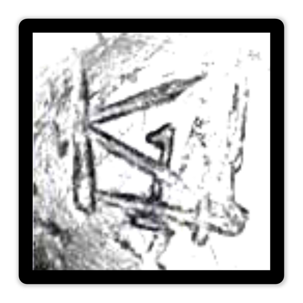 Depending on how you rotate the image, you'll see a K and an M. In this photo, you see a "K" tilted 90 degrees. Look again and you'll see an upright "M". Ignore the number 1, as it's the maker's stamp. The carving was somewhat sloppy, but it was likely done by a kid.