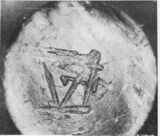 Markings on the handle end of the baseball bat used as a murder weapon.
