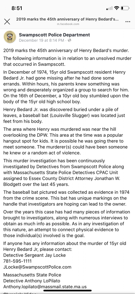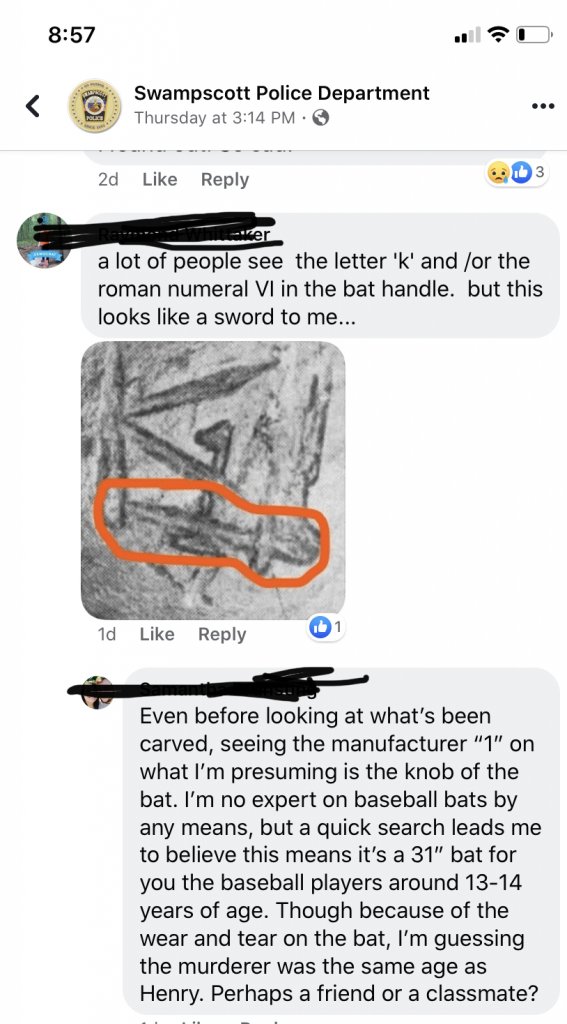 The boy (of course now a man 45 yrs later) left this comment on the thread, he’s the one who found Henry’s body. He’s named in the chronicle segment and the comments on that thread are public so I didn’t block out his name here.