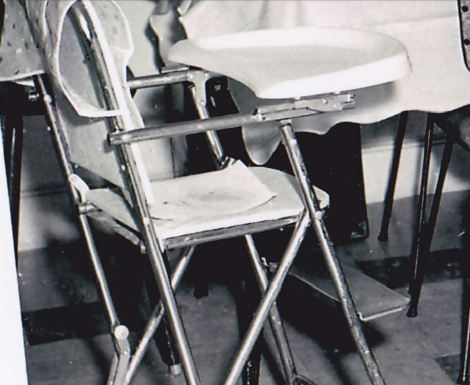 There appears to be a dirty (blood-stained?) paper towel on the seat of the high chair.