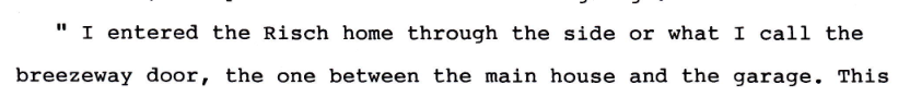 Also...Could someone please explain to me what a "Breezeway" is? I have never come accross this term before and I know there was some discussion about it earlier that I couldn't quite follow about whether the garage had a door directly to the house and since Segeant McHugh states he entered that way I thought it might be important?