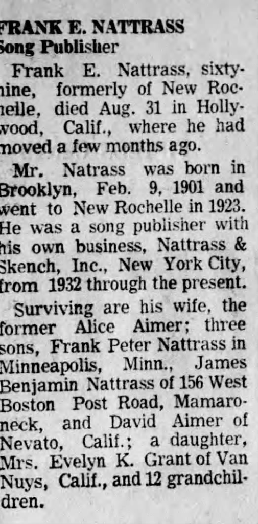 Here is the obituary of Frank E. Nattrass (Joan's uncle / adoptive father who allegedly abused her). He died in 1970, just a few months after moving out to Hollywood, CA -- I believe to join his wife out there?