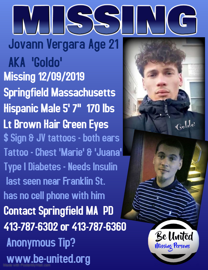 Jovann, a.k.a. 'Goldo' does suffer from type I diabetes and did not have any Insulin with him, which is required daily. His mother reported that Jovann was on his way to her home, from his step father's home, and never arrived. He is known to frequent the North End/Plainfield Street area. Jovann was last seen in the area of Franklin Street in Springfield Massachusettes. He has not been seen or heard from since. Jovann's mother Marie has been a firm supporter of her son and in trying to located him. She reportedly got very little media attention on his case and little initial help from Law Enforcement. Many groups have tried to help now, but Jovann is still missing. One terrible stroke of luck was in the police not taking the Missing report initially - allowed many days to pass with no one checking web cams and videos of the area. Most had been recorded over by the time investigation took off.