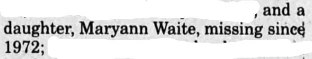 Circumstances of Disappearance: May Ann Waite was last seen on June 1, 1971.
