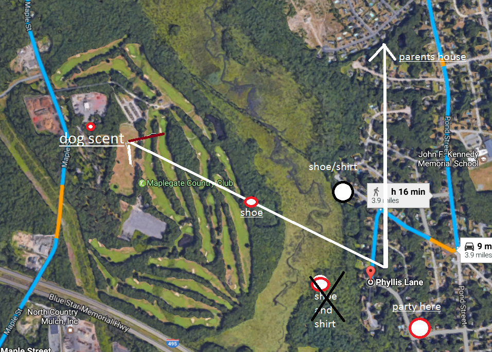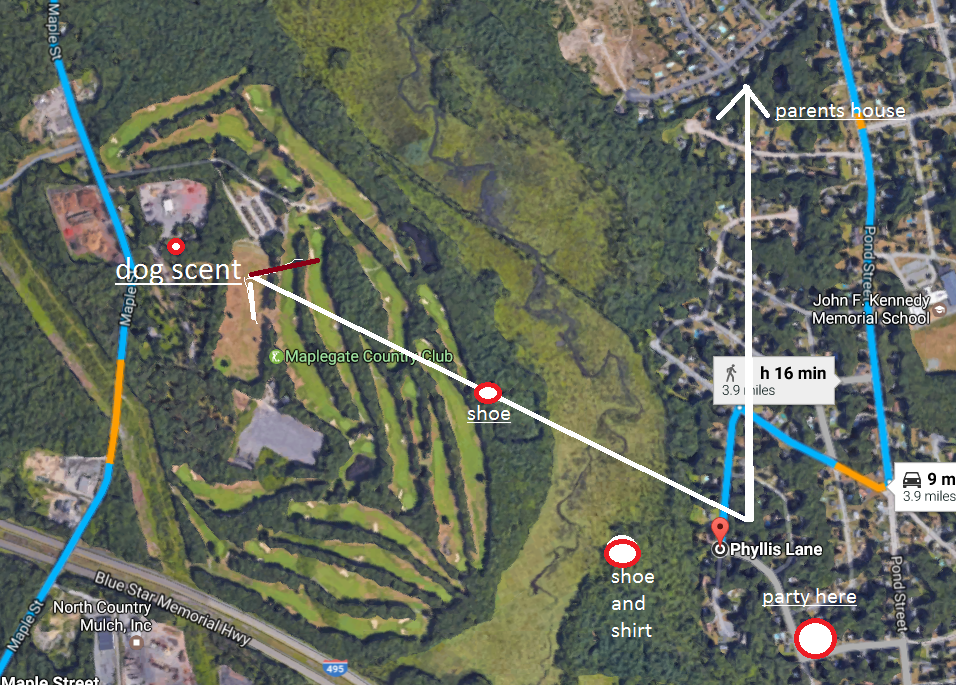 Cdogstu99....great job with the maps. I wonder how accurate the scent dog is? Over the winter a woman was missing in Sanford Maine I believe and the dog tracked her to a spot several miles away. She was later found only a few hundred yards from where she disappeared in Sanford.