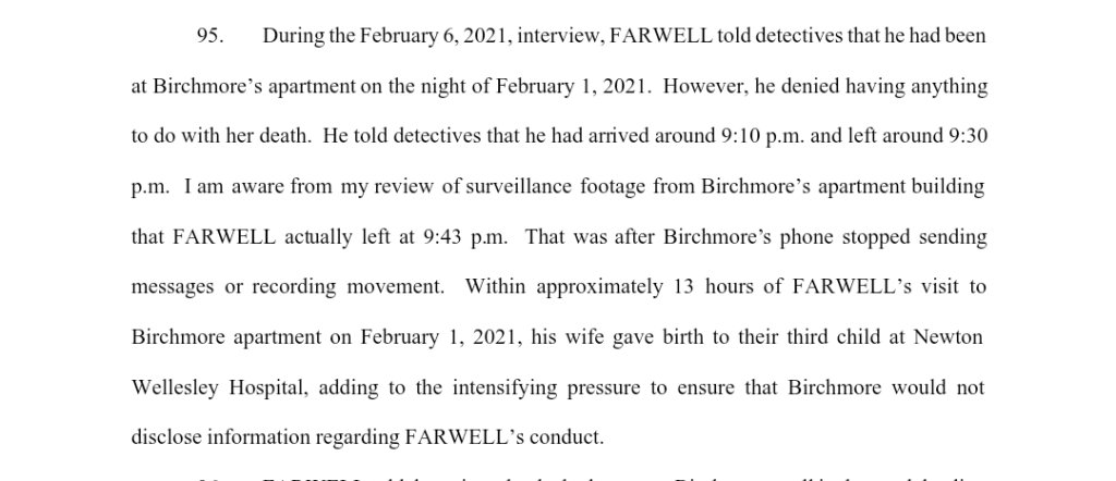 "The family members observed that the necklace’s chain was broken, but not at the clasp. Therewas also a large clump of hair on the chain. From my review of the crime scene photos, I observedthat, while the strap was still around Birchmore’s neck, the necklace was broken and hanging fromthe left side of her neck. The necklace’s charm was on the right side of her abdomen."