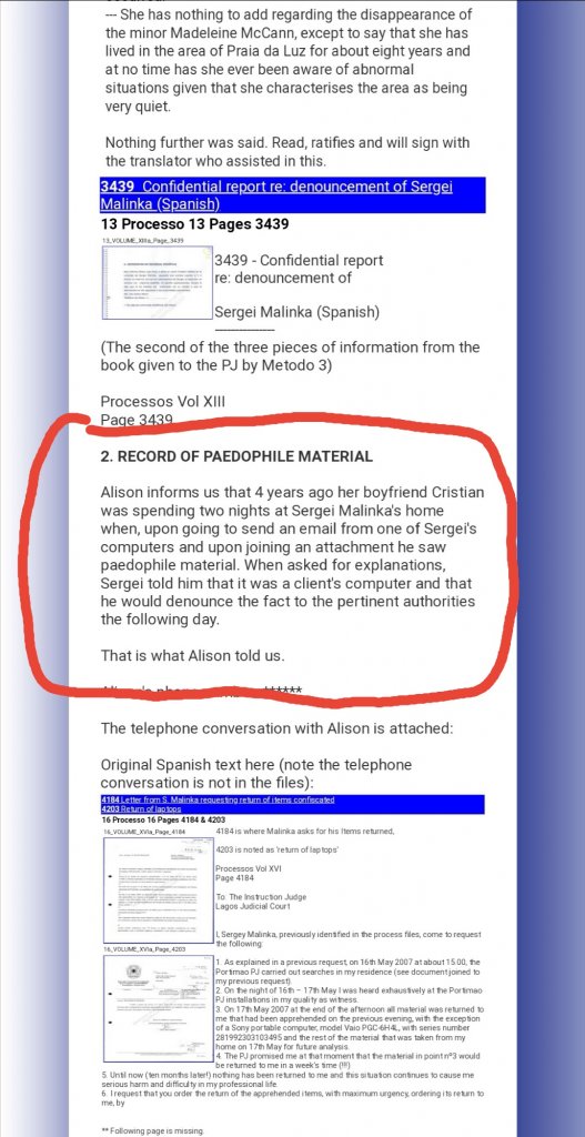 Alison informs us that 4 years ago her boyfriend Cristian was spending two nights at Sergei Malinka's home when, upon going to send an email from one of Sergei's computers and upon joining an attachment he saw paedophile material. When asked for explanations, Sergei told him that it was a client's computer and that he would denounce the fact to the pertinent authorities the following day.