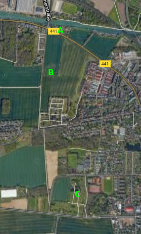 I agree the tents photo is looking south towards the town cemetery however in the photo there are fence and trees to the left. Could the tents be at about 52.385843, 9.650279 ??? (I assume the clear pathways cut through the crop are just temporary features).
