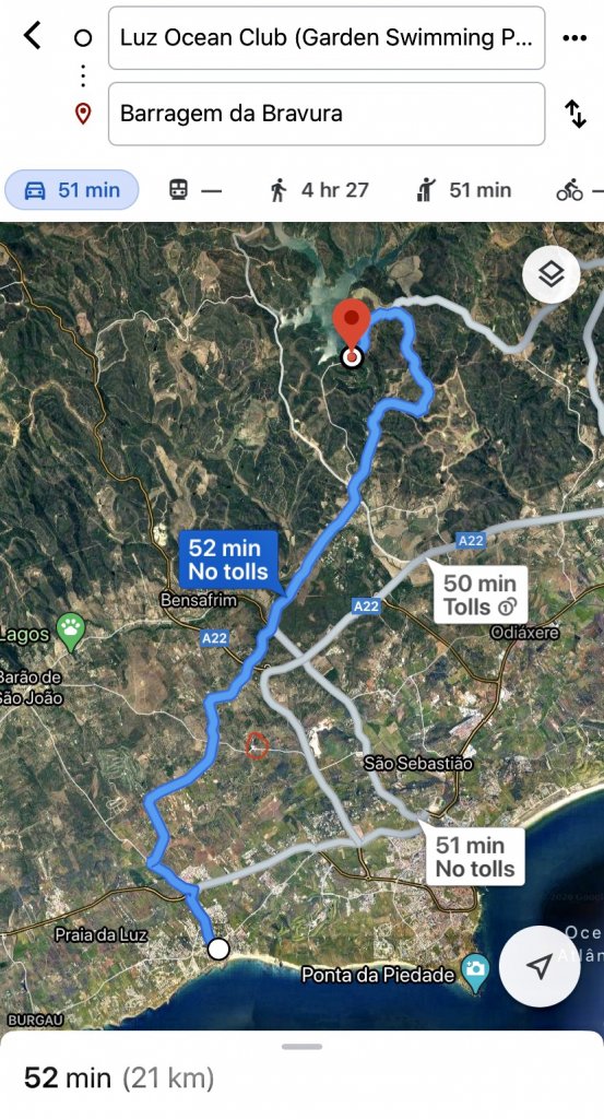 The entire journey from the OC to the Barragen da Bravura (This is the dam, the reservoir is the Albufeira da Barragen da Odiaxere) is 21km - pretty close.