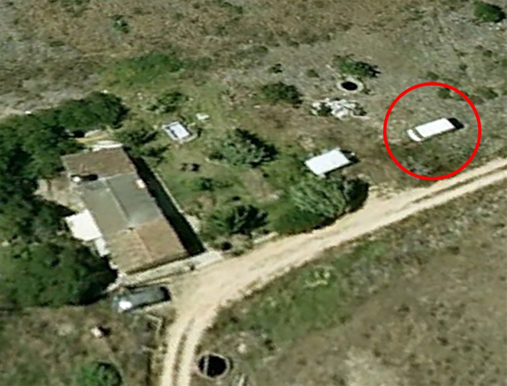 Am trying to work out what object is at curved part of road just in front of house , dark grey , perhaps metallic looking. Could that be a car trailer ? Perhaps lengthwise more likely than at white rectangle to right.