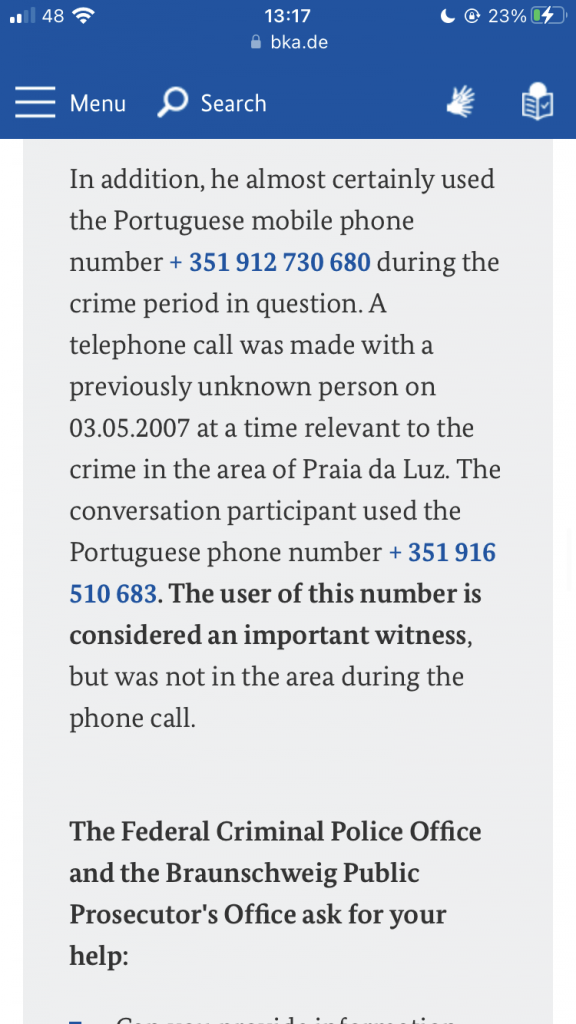 HCW has already said BKA have enough evidence to charge CB with Madeleine's murder. However, imo that is not enough when they are also seeking people who may have knowledge of the passage of the crime. CB reportedly had " a horrible job to do in Luz" and also seems to have come into a substantial sum of money in the weeks following Madeleine's disappearance. I don't think it's enough to just convict the alleged murderer when it seems that there is at least one other co-conspirator still unpunished.