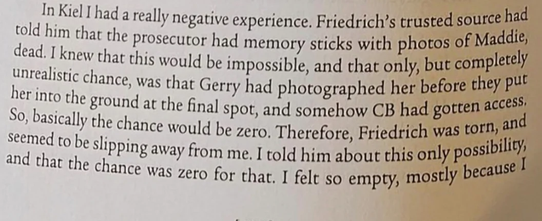 One of the conspiracy authors (FD) says he was with FF when FF was told (phone call) that the BKA have images of MM found on one of his USB’s. But with any of the gossipy authors, believing them is not a clever strategy.