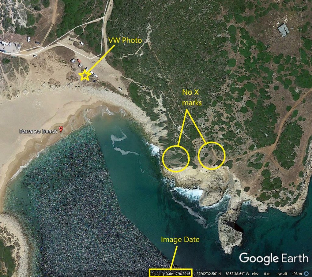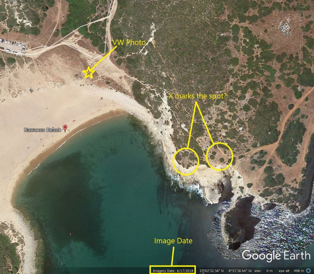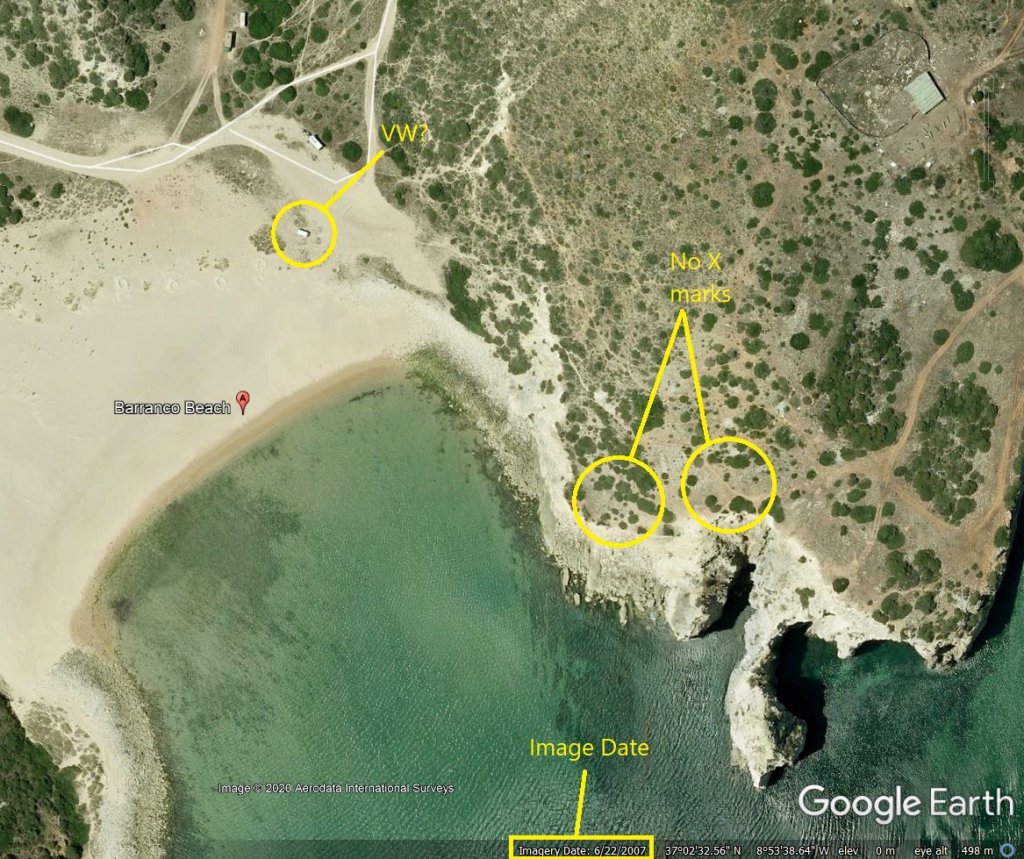 Wierd just looked at Praia barranco,and the cliff behind the van,this is on top of the cliff on google earth,what looks like an x,x marks the spot?