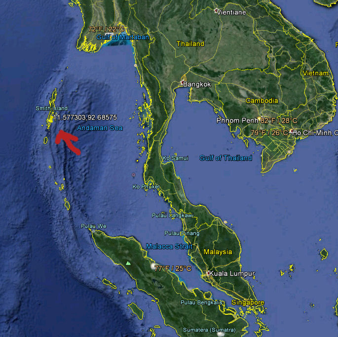 I will look for the post but I think someone posted north of the Strait of Malacca in the Andaman Sea near Port Blair in South Andaman Island