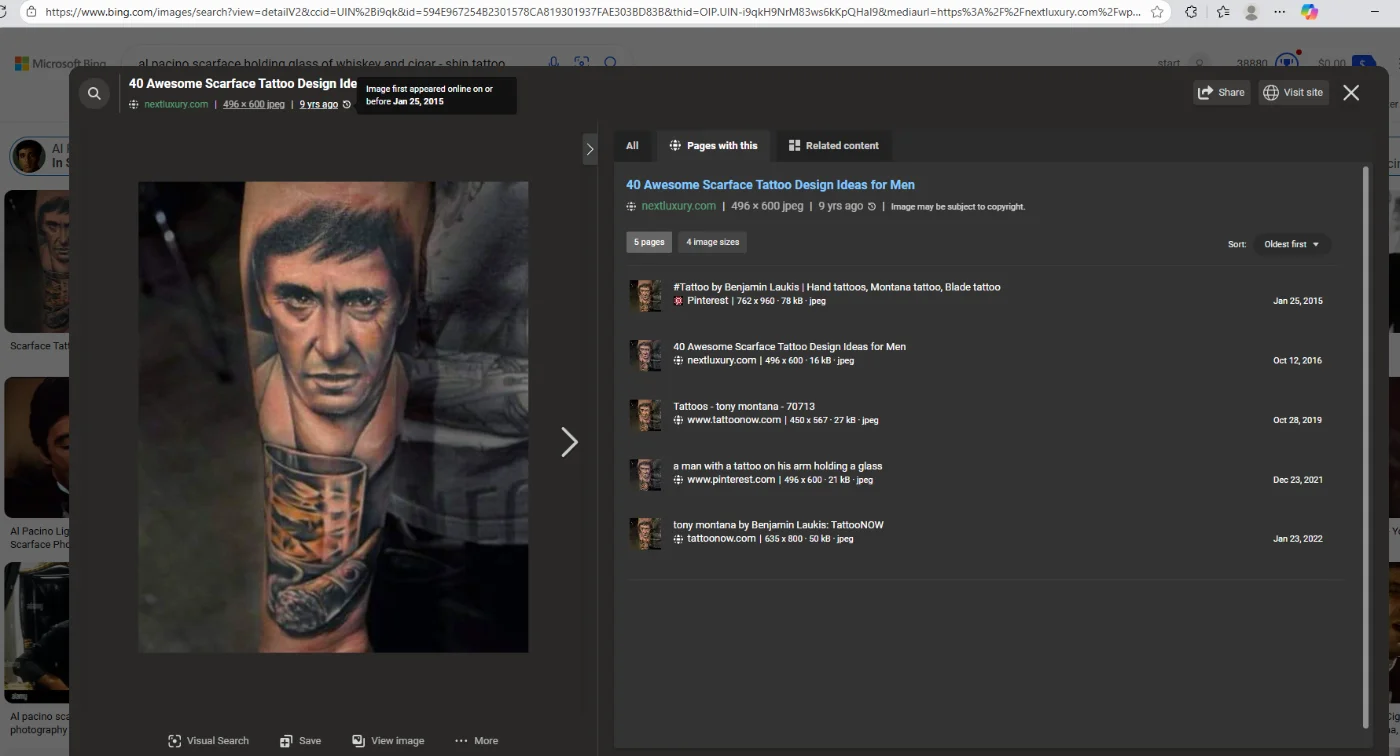 - Right anterior shin: Al Pacino Scarface character holding glass of whiskey and cigar.