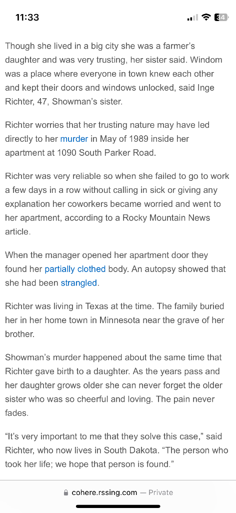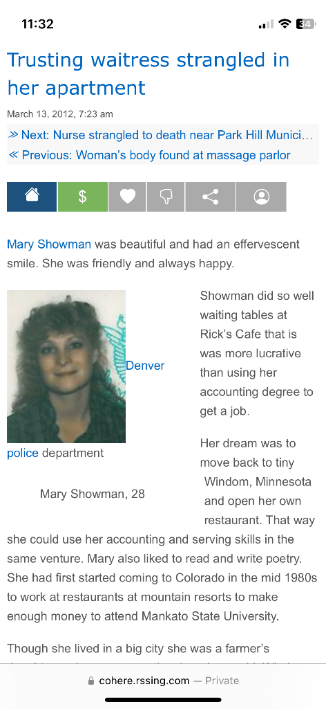 On May 12, 1989, 28 year old Mary Showman was found strangled to death inside her apartment located near Mississippi Avenue and South Parker Road. She had been dead several days prior to her discovery. Mary's vehicle was not parked near her apartment complex, but later found abandoned several blocks away. Anyone with information regarding this case, is asked to please contact the Denver Police Department.