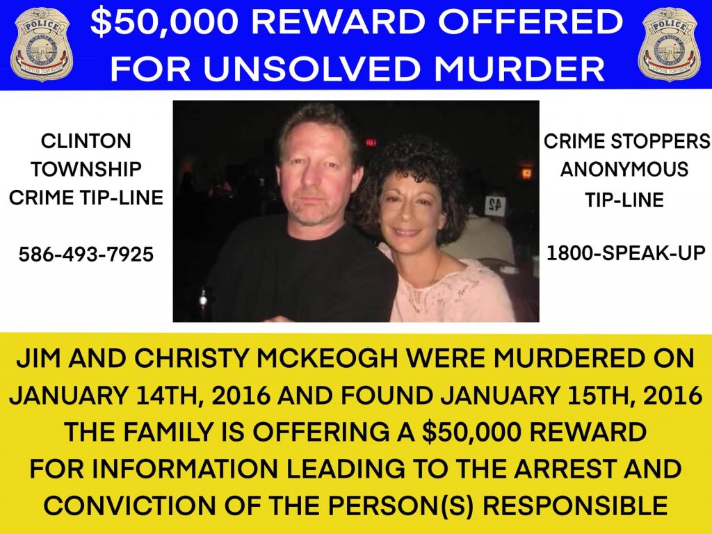 On January 14, 2016, a person or person approached the Uthers St home (near 18 Mile and Hayes if you're local) and assaulted Jim McKeogh who was in the garage of the home. He'd recently finished clearing snow from the walk and drive. After beating Jim savagely, the killer entered the home and attacked tiny Christy McKeogh. Christy tried to run out the front door of the home, she didn't make it.