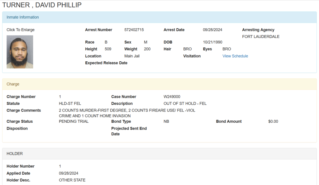 "Turner is being held at the Broward County Jail, awaiting an extradition hearing. According to the Broward County Court Clerk, he is due back in court at 9 a.m. on Tuesday.