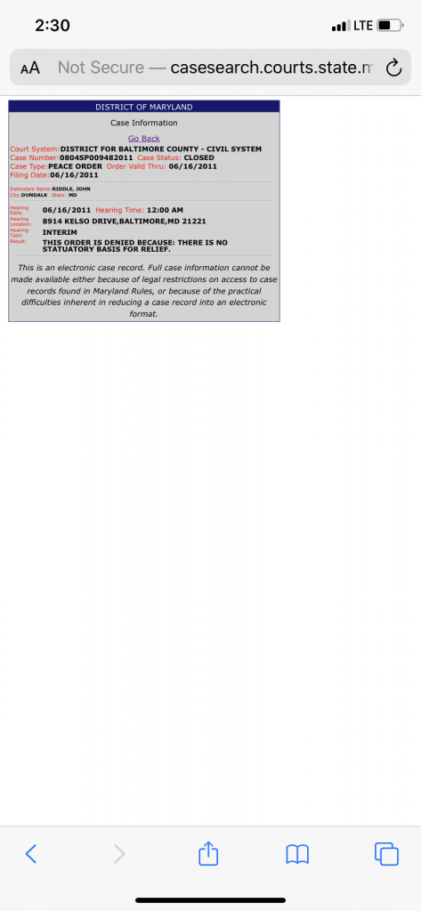 I went to the Maryland Judiciary Case Search and couldn't find any Peace Orders or DV (Domestic Violence) offenses against JR. Maybe there is another JR with those charges.