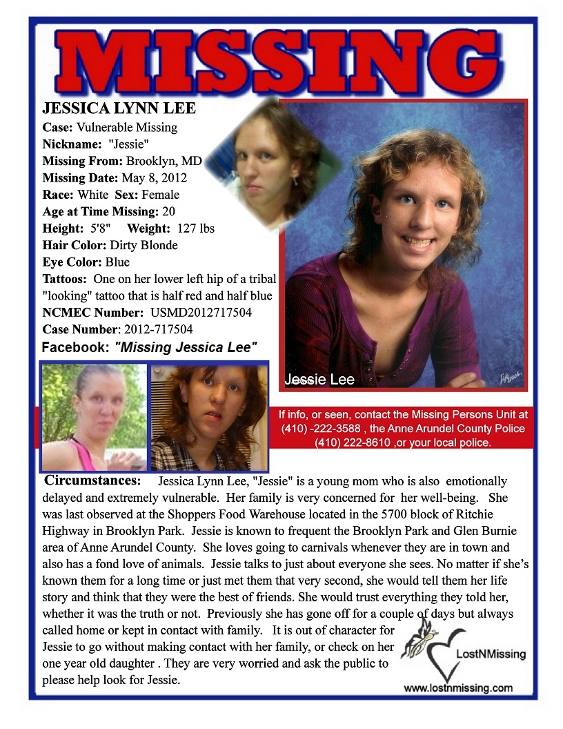 Melody, When first hearing of the body of a young girl found in the woods I also immediately recalled seeing JessicaLee on Maryland Missing Person and got an weird feeling it was her.