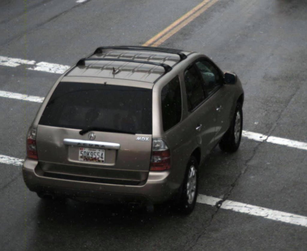 She is driving her 2005, gold, Acura MDX, MD tag 5DK9554.