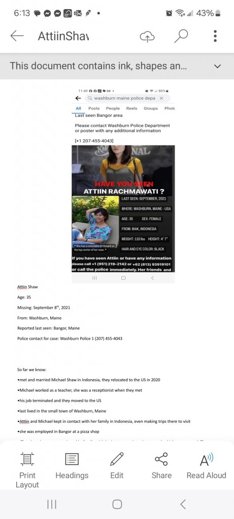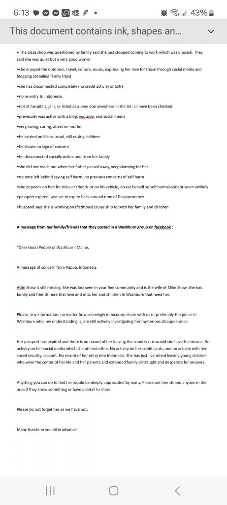 I can't find a single MSM source but her NAMUS page is here. Large internet footprint but no posts from husband or family?
