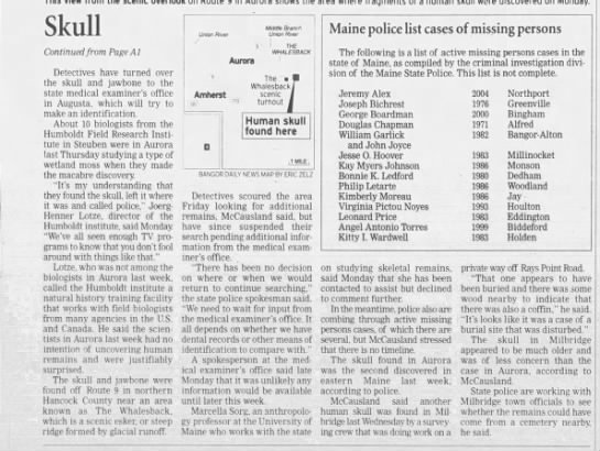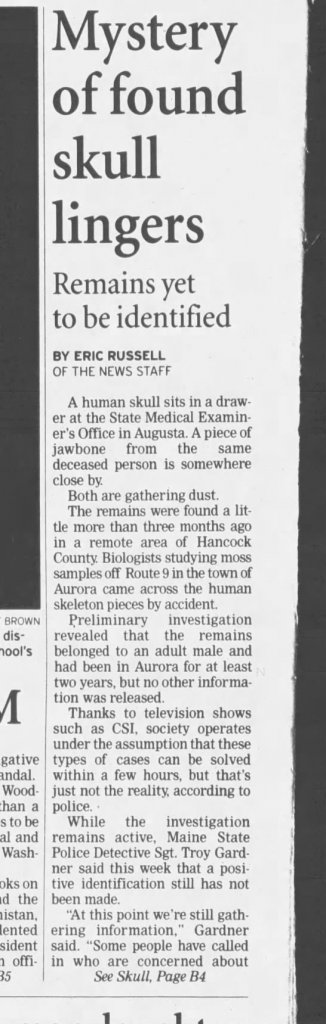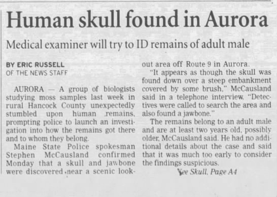 Skull was located below the Whalesback on Route 9 in Aurora. It was found on a slightly elevated portion of ground with several tress. About 10 feet away was a maroon colored sweater.