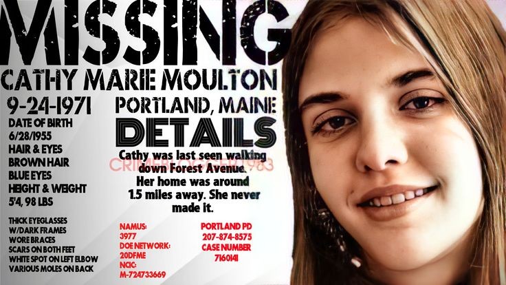 Also, the subject of the True Crime All the Time Unsolved podcast of February 7, 2021 was Cathy Moulton. The podcast incorporates the information from The Resource Center for Cold Case Missing Children's Cases.