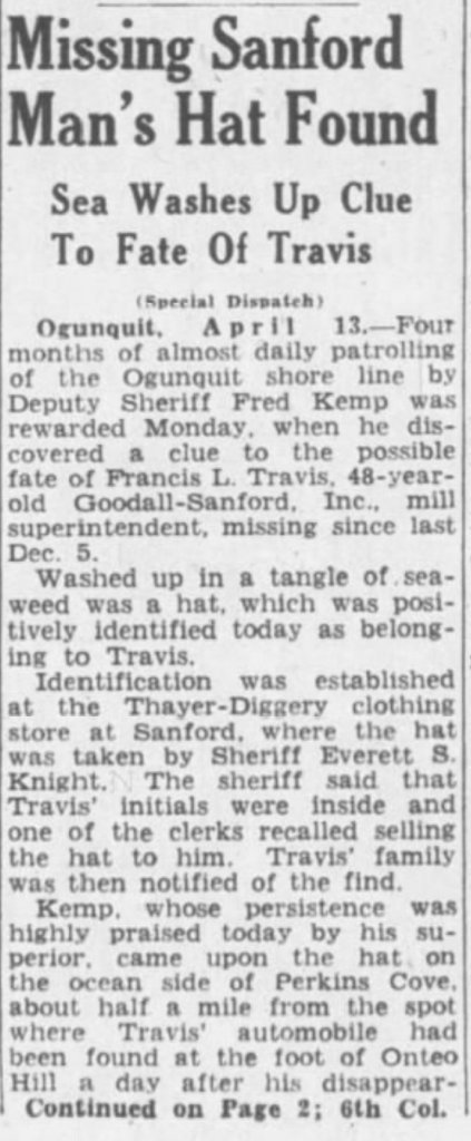 Travis disappeared from Sanford, Maine on December 5, 1947. He was last leaving his residence that morning as he left for work as usual. He has never been seen or heard from since. The next day his car was found abandoned in Ogunquit but there was no trace of him. His whereabouts remain unknown.