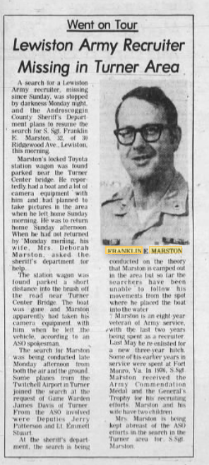 Franklin Marston was last seen at home on July 31, 1977. His locked Toyota station wagon was found parked a short distance into the brush near the Turner Center Bridge. He had a canoe and camera equipment with him and had planned to take pictures along the Androscoggin River in Turner. He was supposed to return home later that afternoon. When he did not return home the following morning, his wife reported him missing.