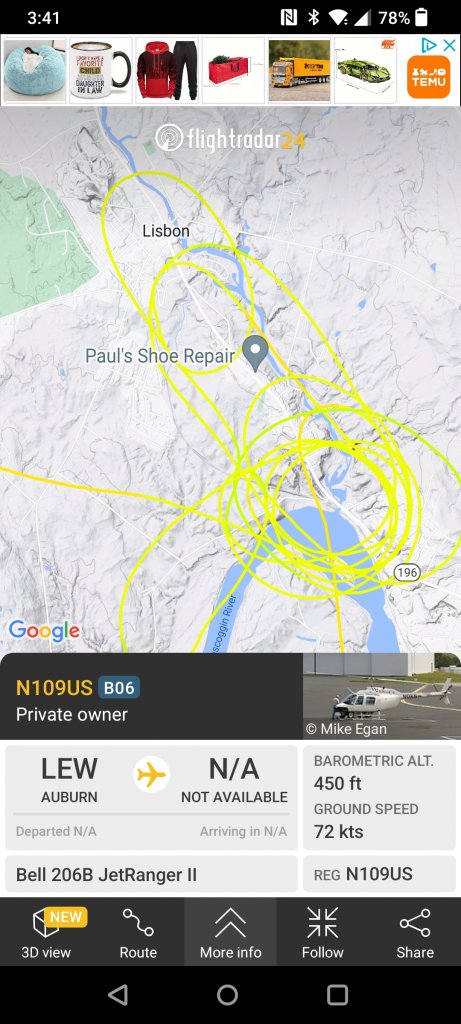 Now I found it. The helicopter route (shown below in yellow) is continuing to make wider and wider sweeps in circles around the Androscoggin River at Route 196.