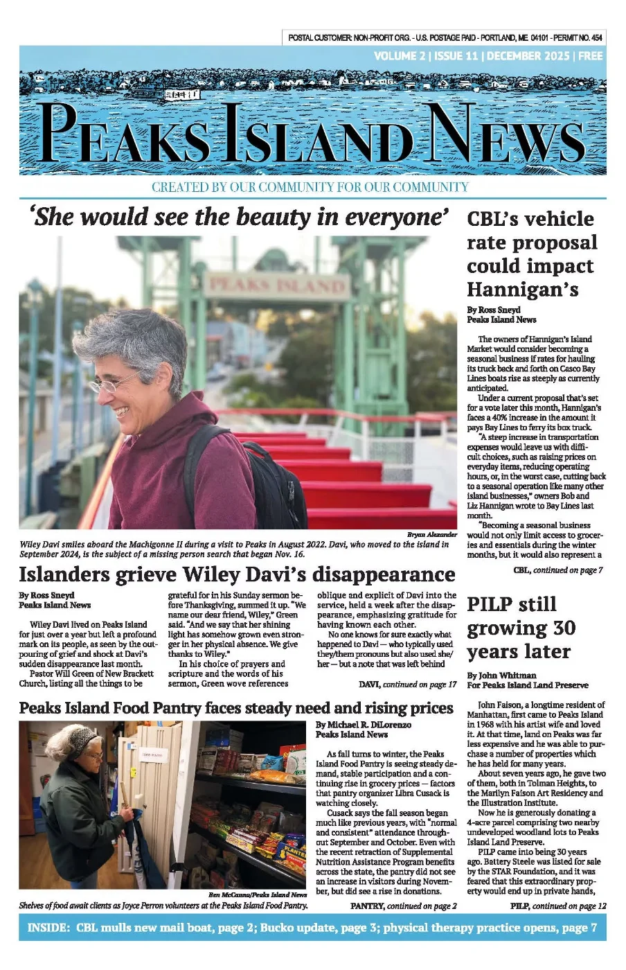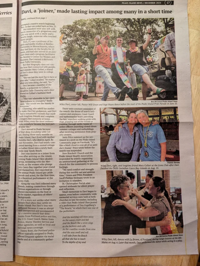 Wiley Davi, 57, who lives on Peaks Island, was last known to be on the island, which is off the coast of Portland, on Saturday evening, according to the Maine Department of Inland Fisheries and Wildlife.