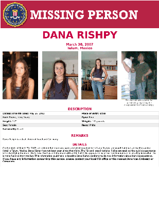 Dana Rishpy traveled to Mexico for a break in March 2007 after visiting the United States to look for graduate schools. While there, she accepted the invitation of an American to stay at a cabaña in Tulum, a smaller beach town south of Playa del Carmen on the Yucatan Peninsula, according to witnesses and e-mails she sent her family. She was seen by many people at a party in Tulum in late March but then disappeared.