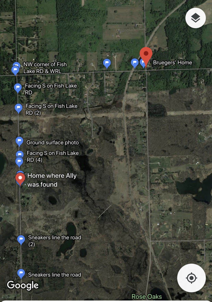 The thing is if Ally had already made a loop and was headed north (i.e., on her way back) on Fish Lake Road when she was shot, she likely had been in the area south of the property where she collapsed. Unfortunately, I had to take my son to his last game before we got to explore that area, and looking at satellite images, the area appears more remote than the area between the Bruegers’ home and the house where she was found.