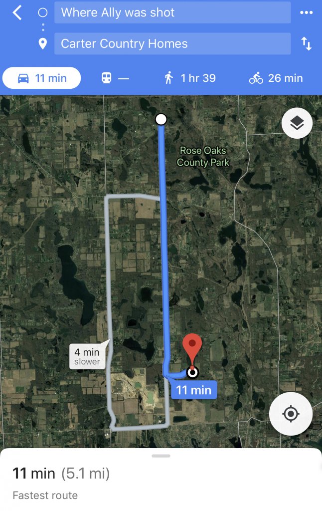 So I did some digging and found out that there is only one residential property to the south of the property where Ally was found, and beyond the eastern and southern ends of that property is a 640-acre county park: