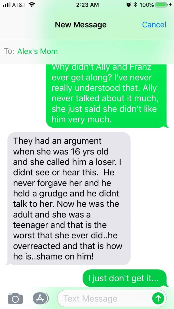 Also...Is there any way you can put down a rough timeline of what transpired (from what you know) regarding Ally, from just that Friday and Saturday? Like the time you last talked or texted her/brief description of content... then any concrete details you know of regarding Saturday. I realize there are bits and pieces of some of this in the thread, but sometimes it helps for us to see it put together in one place -- and maybe it will also jog your memory of something.